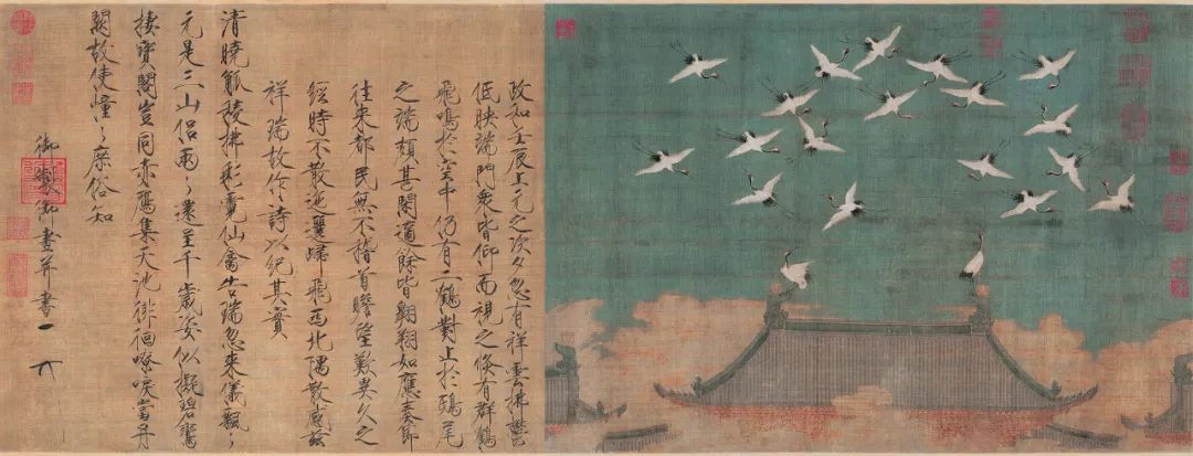现藏于辽宁省博物馆的《瑞鹤图》是北宋皇帝宋徽宗赵佶的作品,它描绘了二十只形态各异的丹顶鹤出现于北宋汴梁(今河南开封)宫城正门宣德门之上的场景,这既是宋徽宗艺术创作成果中的精品,也是北宋瑞应图的典型代表。