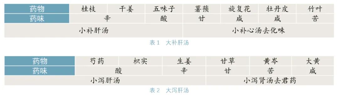 五藏补泻之方又分大汤、小汤,其组方都可以用此图推求。大汤由于涉及他脏,补泻力度更大一些,因此,组补方时会在本脏小补汤的基础上加子脏小补汤(去其化味道),也即兼补本脏与子脏。组泻方时会在本脏小泻汤的基础上加母脏小泻汤(去君药),也即兼泻本脏与母脏。如大补肝汤与大泻肝汤的药物组成如表1和表2。