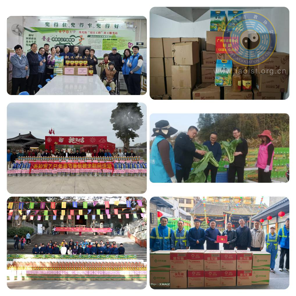 为进一步做好慈善公益事业,弘扬道教“齐同慈爱,济世利人”的慈善理念,广州市道教界积极开展新春慈善慰问活动,以实际行动助力“百千万工程”。广州市道教协会积极帮扶湛江市雷州市唐家镇,采购油、米等慰问品,捐赠给贵州省毕节市宗教活动场所及广州市越秀区珠光街道困难群众。三元宫、仁威祖庙组团帮扶从化吕田村,捐赠蔬菜。三元宫会同六榕街道举行2025年“迎新春、送温暖、献爱心”慰问活动,慰问环卫工人及困难群众,并走访象冈山社区独居老人。都城隍庙向北京街道和大塘街道捐赠米和油。赤松宫开展“乙巳年春节善信敬老慰问活动”,向大岭村村民及老人赠送米、油等生活物资。白云仙馆联合敏柔集团开展“登峰街2025年新春慰问活动”,慰问街道困难群众。
