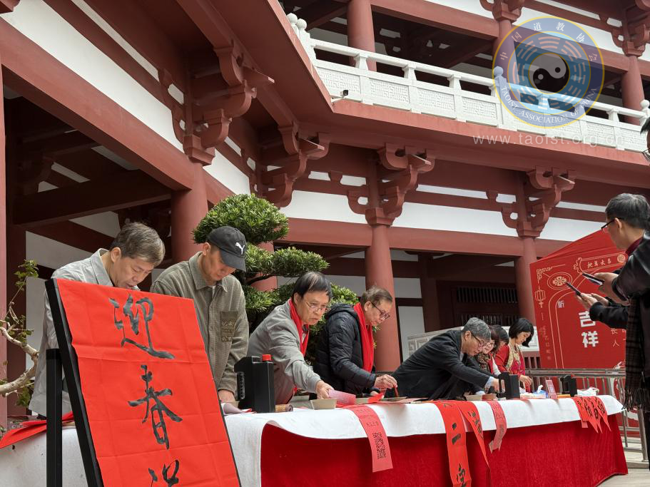 各场所始终践行绿美生态发展理念,结合已有的绿植和盆栽,精心在场所内增设年花、年桔、春联、灯笼、彩旗等布置,为道教活动场所清幽自然的绿美氛围注入了广府特色年味。为传承并大力弘扬中华优秀传统文化,各场所纷纷举行丰富多彩的迎春送福活动。如三元宫协办“古风墨韵送新春,福满六榕情意浓”——六榕街2025年迎春送福活动;纯阳观特别邀请梅社书画院的书画家,为公众撰写福字斗方与对联;都城隍庙、黄大仙祠、赤松宫、大仙庙举办迎春接福、慈善挥毫、赠福写春联活动,获得市民群众的广泛喜爱。